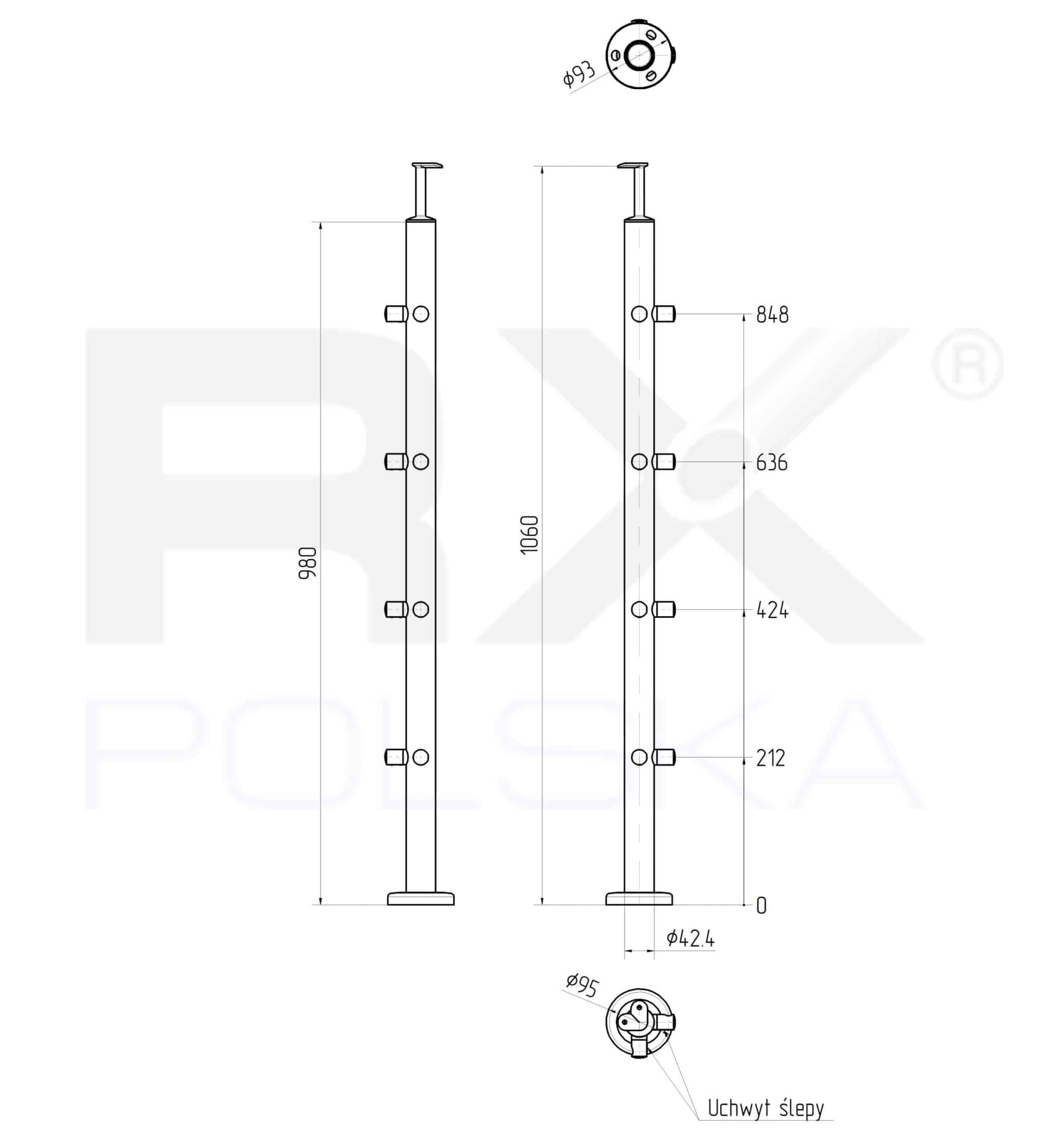 Stolpe 42,4mm med 4 tverrstangholdere for rør 16mm, AISI 304, SPEIL