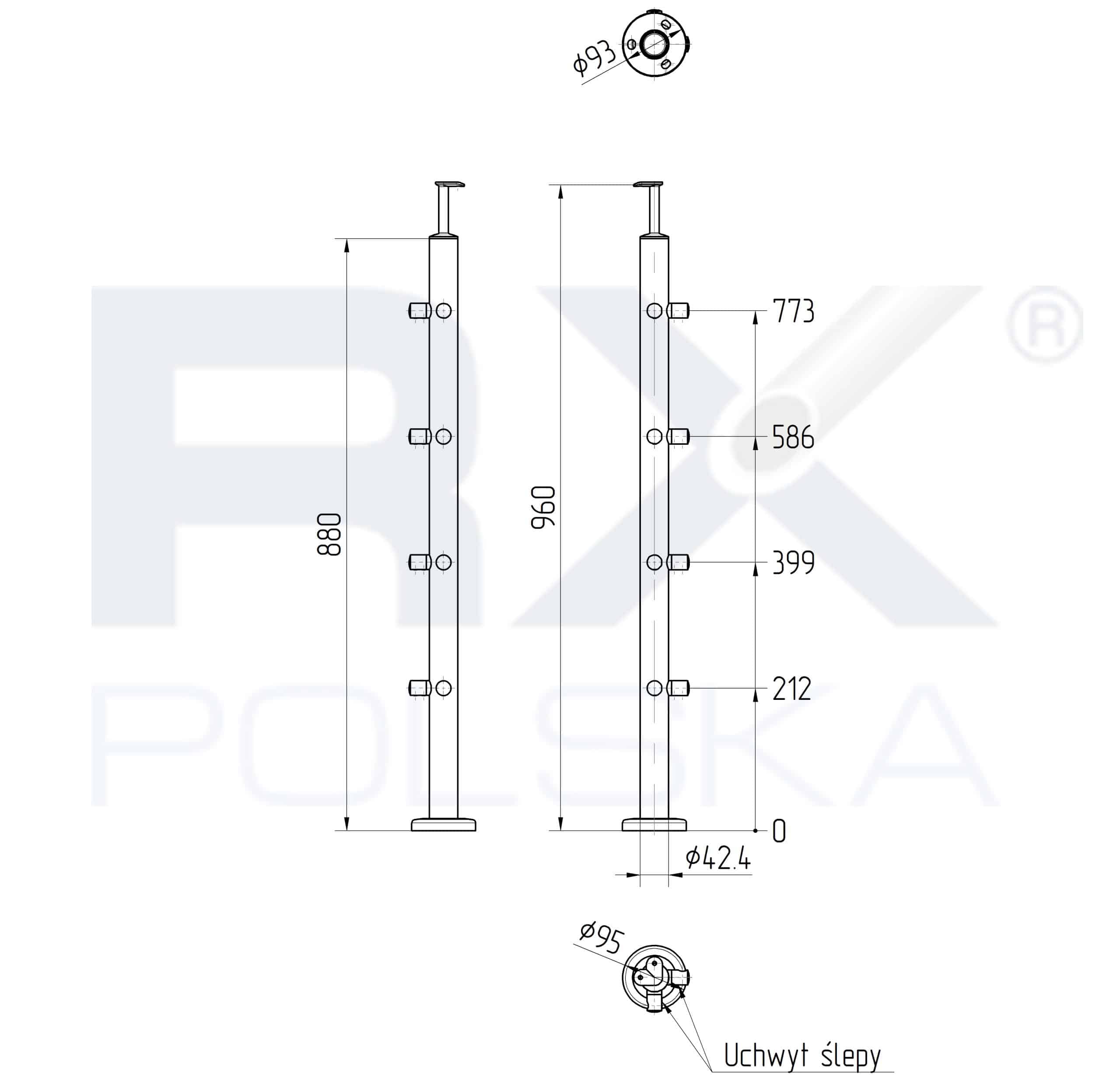 Stolpe RIGHTG 42,4mm med 4 tverrstangholdere for rør 12mm, AISI 304, SPEIL