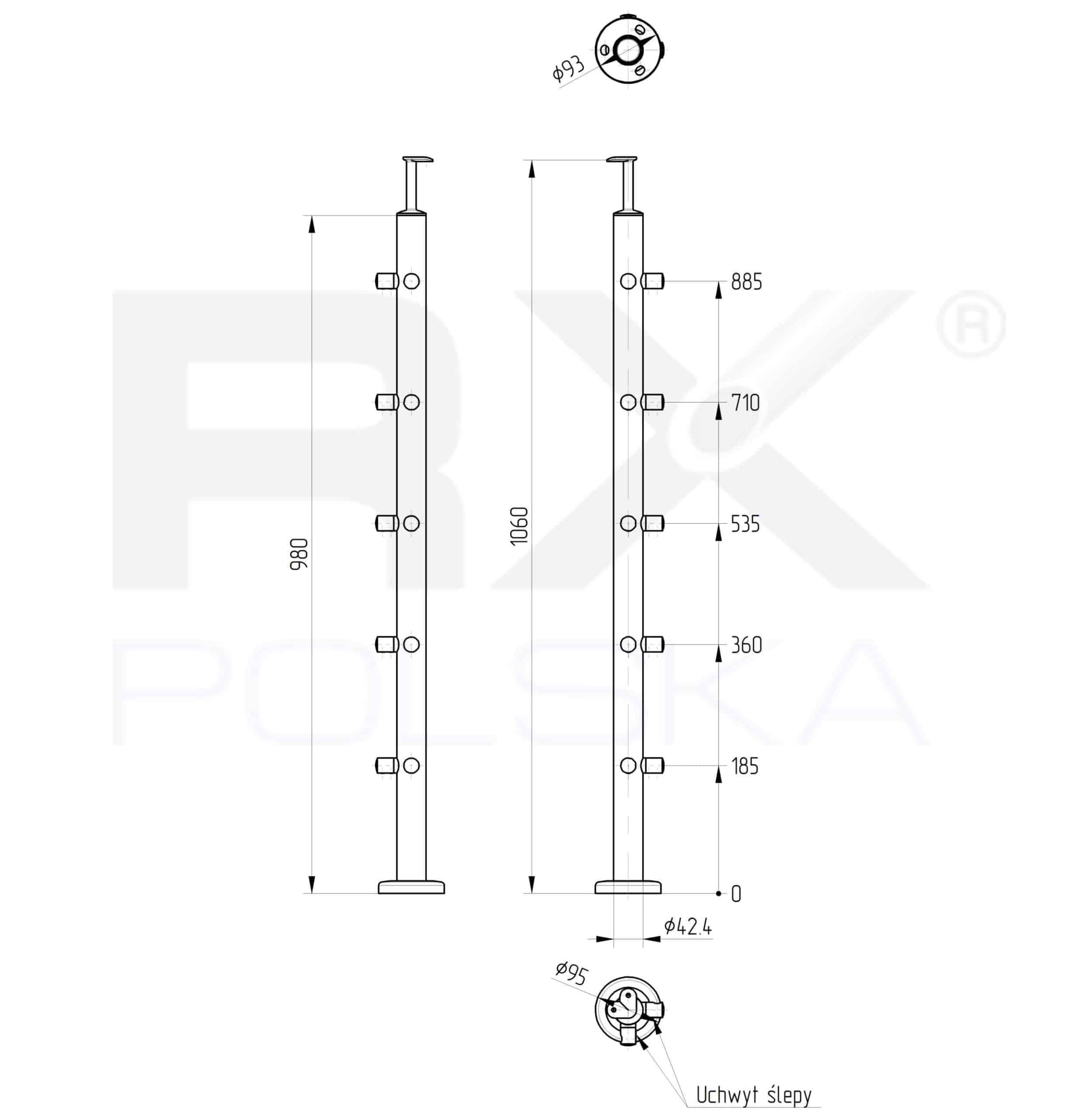 Stolpe RIGHTG 42,4mm med 5 tverrstangholdere for rør 16mm, AISI 304, SATIN