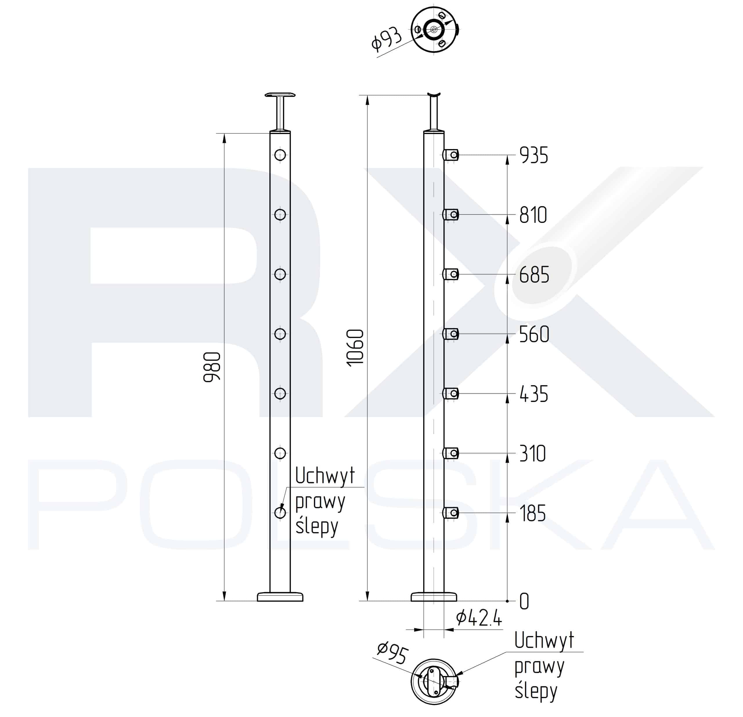 Stolpe RIGHTG 42,4mm med 7 tverrstangholdere for rør 16mm, AISI 304, SATIN