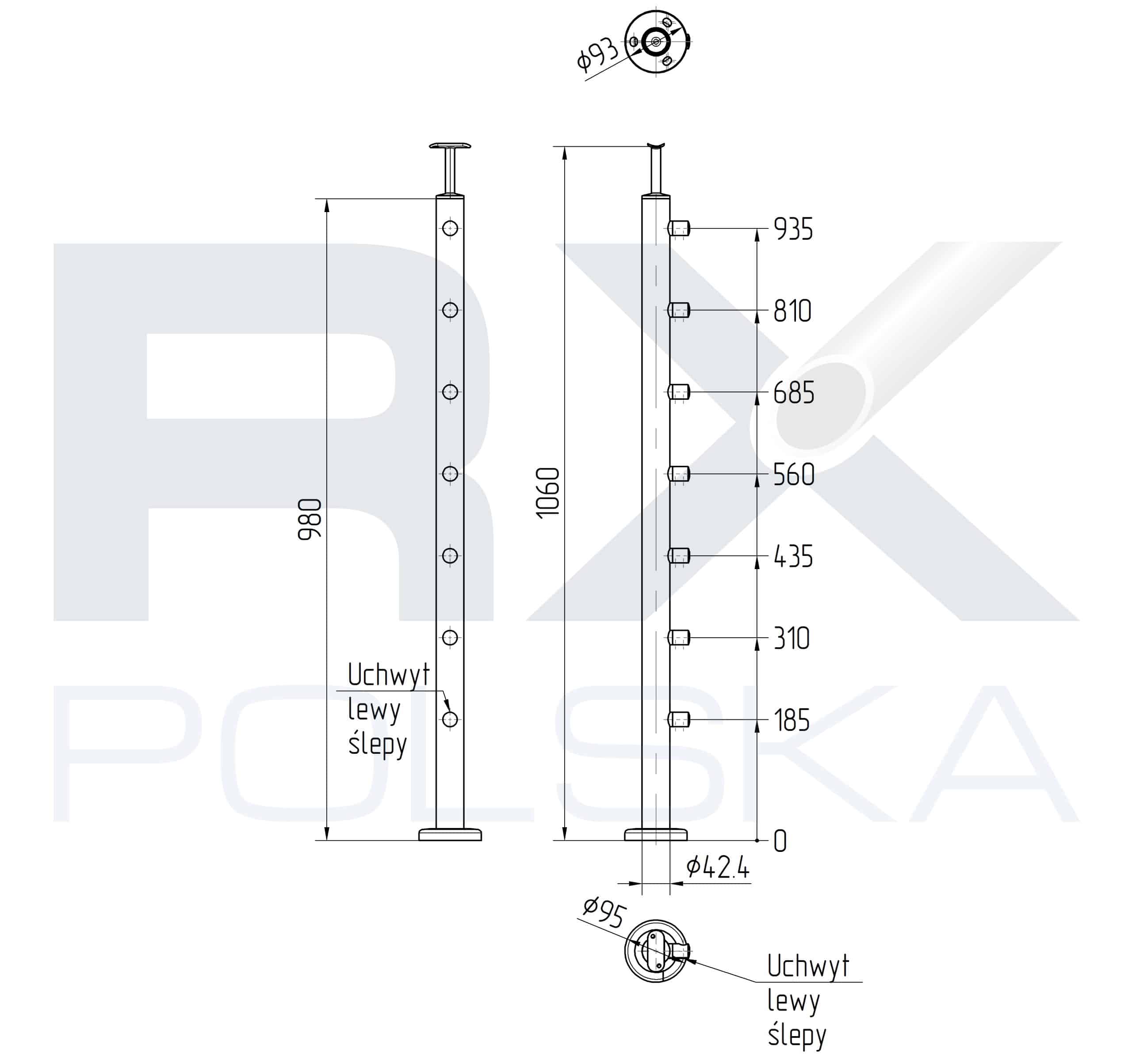 Stolpe VENSTRE 42,4mm med 7 tverrstangholdere for rør 16mm, AISI 304, SATIN