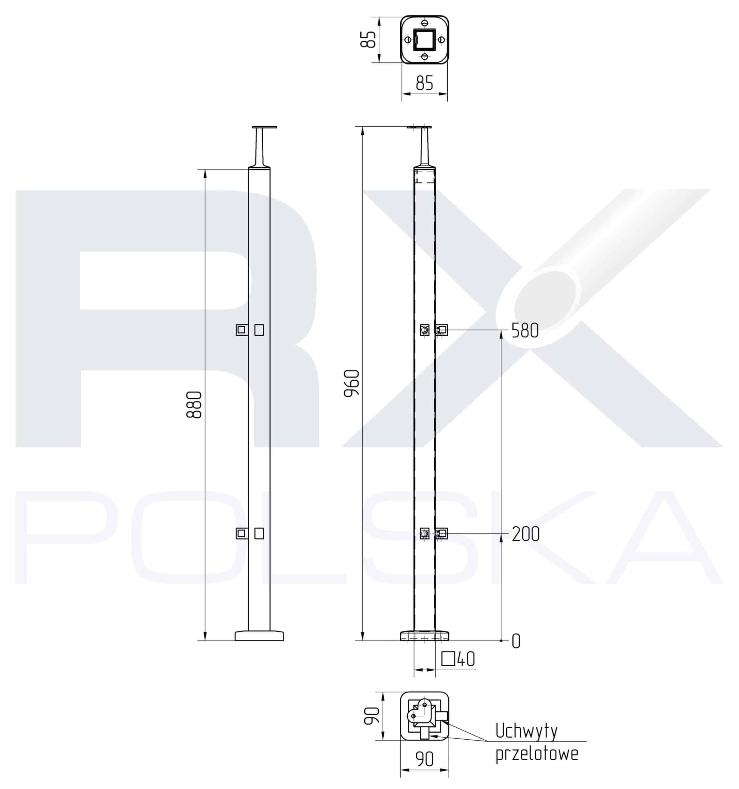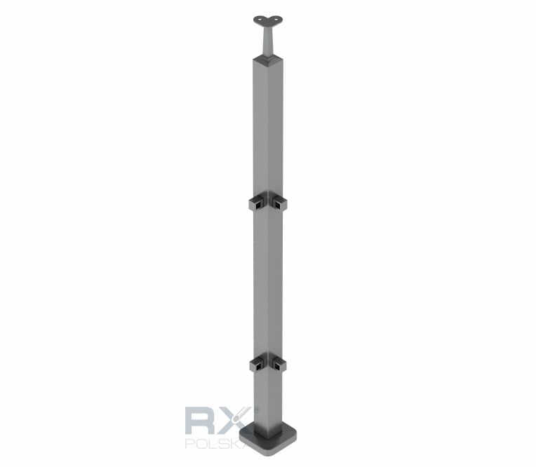 Stolpe HØYRE 40x40mm z 2 tverrstangholdere for rør 12mm, AISI 304, SATIN